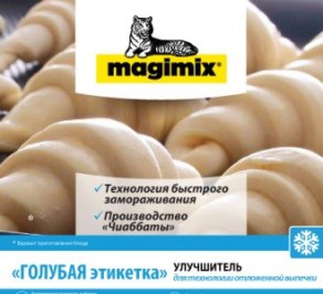 При использовании улучшителя «Мажимикс» с голубой этикеткой для производства хлебобулочных изделий типа «чиабатта» дозировка 2-3%, на слоеные изделия (прямой способ) 1,5-2,5%, для коррекции муки с низким содержанием клейковины 1,5-3,0%.