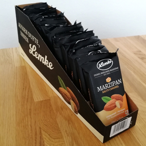 Паста из ядер сладкого очищенного калифорнийского миндаля отборного качества с добавлением соленой карамели. Изготовлена путем традиционного помола без добавления горького миндаля, обладает мягким вкусом. "Чистый" марципан из калифорнийского миндаля и сахара. Содержание миндаля 32%. В коробке 14 уп. по 200г.Универсальная кондитерская паста, применяется в качестве начинки для конфет и шоколада, лепки фигурок, обтяжки и украшения тортов.