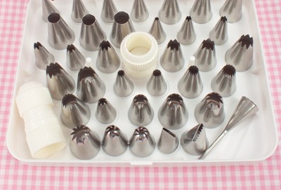 Размеры: высота - 50 мм.Чемодан с насадками содержит комплект насадок разного вида и разного размера, адаптор и стальные "подложки" на ножке для формирования цветов из мастики. Кондитерские насадки предназначены для отсадки различных кондитерских масс из кондитерского мешка, придают изделию красивый вид. С помощью насадок Вы сможете украсить декором торты и пирожные взбитыми сливками, различными кремами.