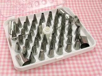 Размеры: высота - 33 мм.Чемодан с насадками содержит комплект насадок разного вида и разного размера, адаптор и стальные "подложки" на ножке для формирования цветов из мастики. Кондитерские насадки предназначены для отсадки различных кондитерских масс из кондитерского мешка, придают изделию вид и размер.С помощью насадок декорируют торты и пирожные взбитыми сливками, различными кремами.