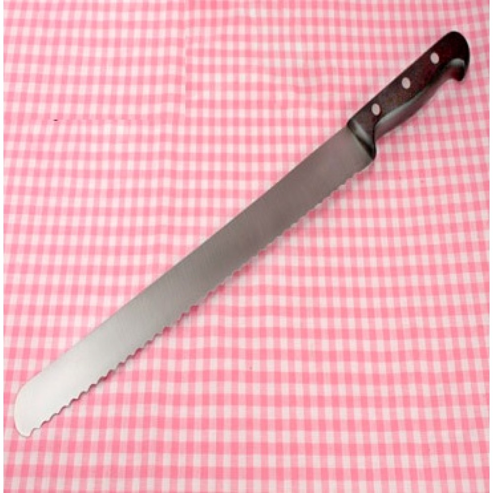 Размеры: длина лезвия - 36 см.Ножи - инструмент, который необходим на кухне ежедневно. Нож позволяет легко и быстро нарезать продукты, а узкие зубчики сделают Вашу нарезку более эстетичной и привлекательной. Очень удобен при работе с бисквитом и хлебными изделиями.