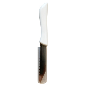 Нож с металлическим рифленым лезвием длиной 8 см, с ручкой из пластмассы белого цвета. Идеально подходит для нарезки теста и формирования надрезов на хлебобулочных изделиях.Состав: Нержавеющая сталь, пластмасса.