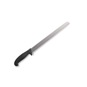 Нож с металлическим рифленым лезвием длиной 30 см., с ручкой из пластмассы. Идеально подходит для резки бисквита, шоколада, сыра, цитрусовых и многого другого.Используется в виде профессионального инструмента в кондитерском производстве для работы с различными продуктами.