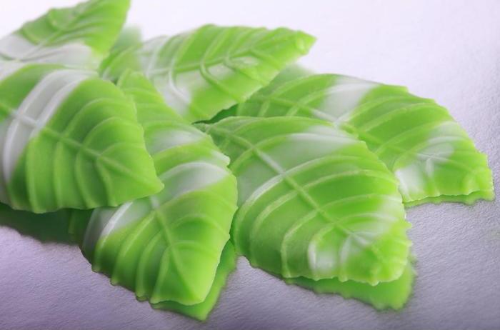 Изделие из цветной кондитерской глазури в форме листочка. Предназначено для украшения сдобных булочных и мучных кондитерских изделий (в том числе тортов, пирожных, вафель, пряников), мороженого и других изделий. Цвет зелёный. Листочек имеет размеры 28х58х5 мм, вес 2,8 - 3,8 г.